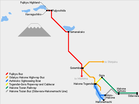 箱根の桃源台駅から御殿场駅までバスを乗って(30分、990円、2時間ごと)、御殿场駅で富士急バスを乗って河口湖に到着いただけます(片道:1時間、1470円。日本鉄道周遊券を除く、箱根周遊券を含む)。