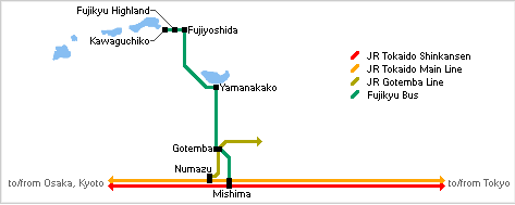時間やお金を倹約するために、三島駅から御殿场までJRを乗って(沼津で乗り換え)、御殿场で富士五湖行きの富士急バスを乗って河口湖駅に到着いただけます(片道:1時間、1470円)。
